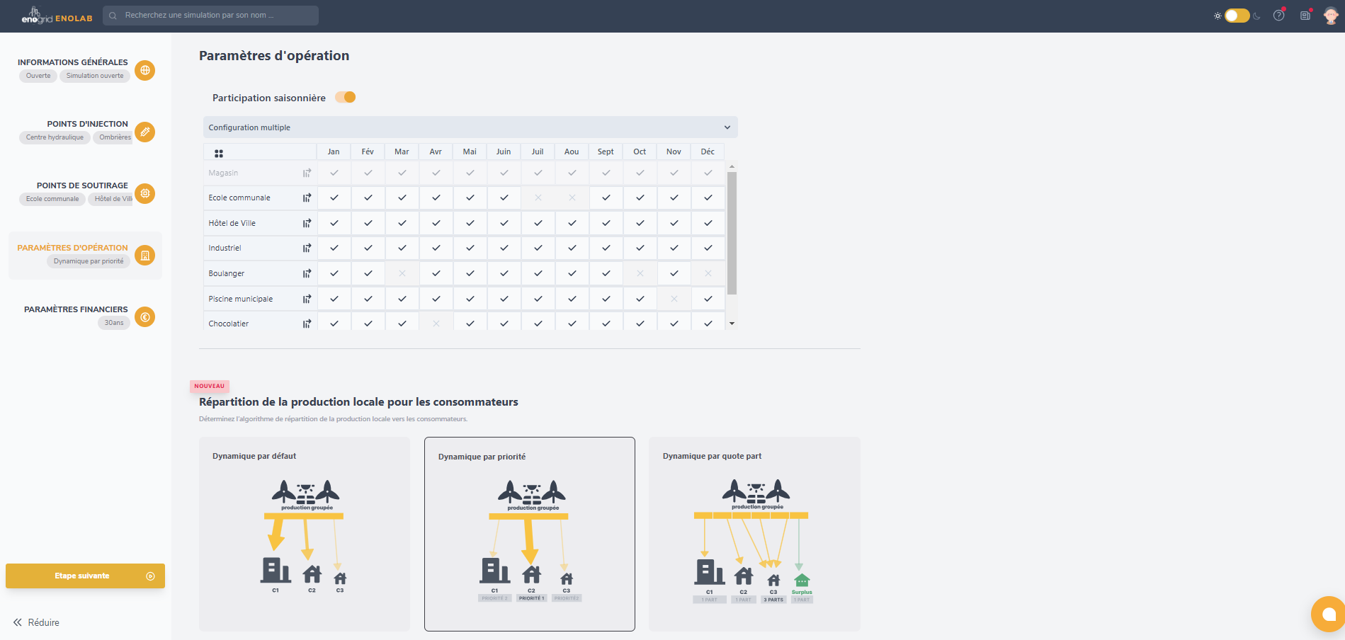 EnoLab est un logiciel de simulation permettant d’étudier rapidement le potentiel et la faisabilité de projets d’autoconsommation collective. Notre solution logicielle, développée à partir des retours d’expériences d’Enogrid sur plusieurs centaines d’études de projets, vous permet de modéliser énergétiquement, économiquement et financièrement vos opérations tout en anticipant les besoins organisationnels.