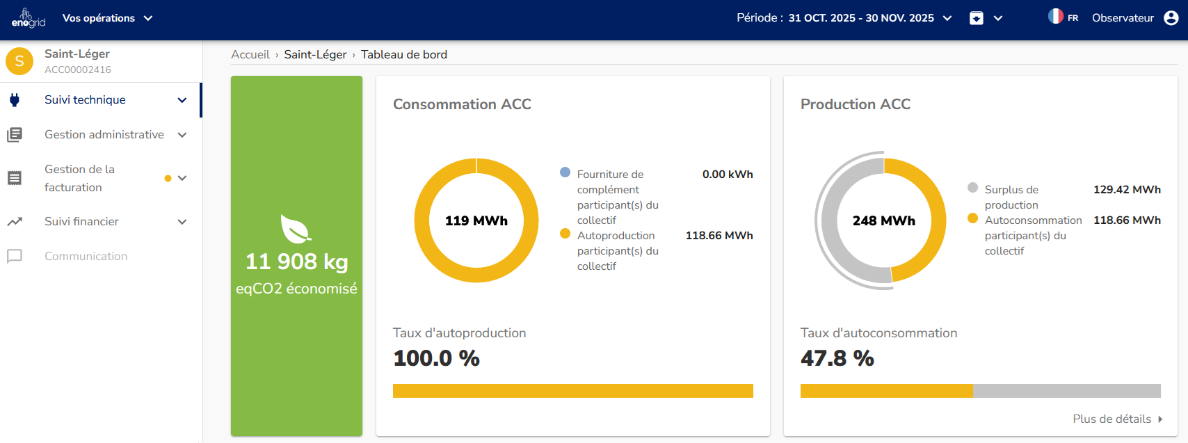 Données EnoPower sur l'autoconsommation collective de la centrale hydroélectrique de Saint-Léger en novembre 2025